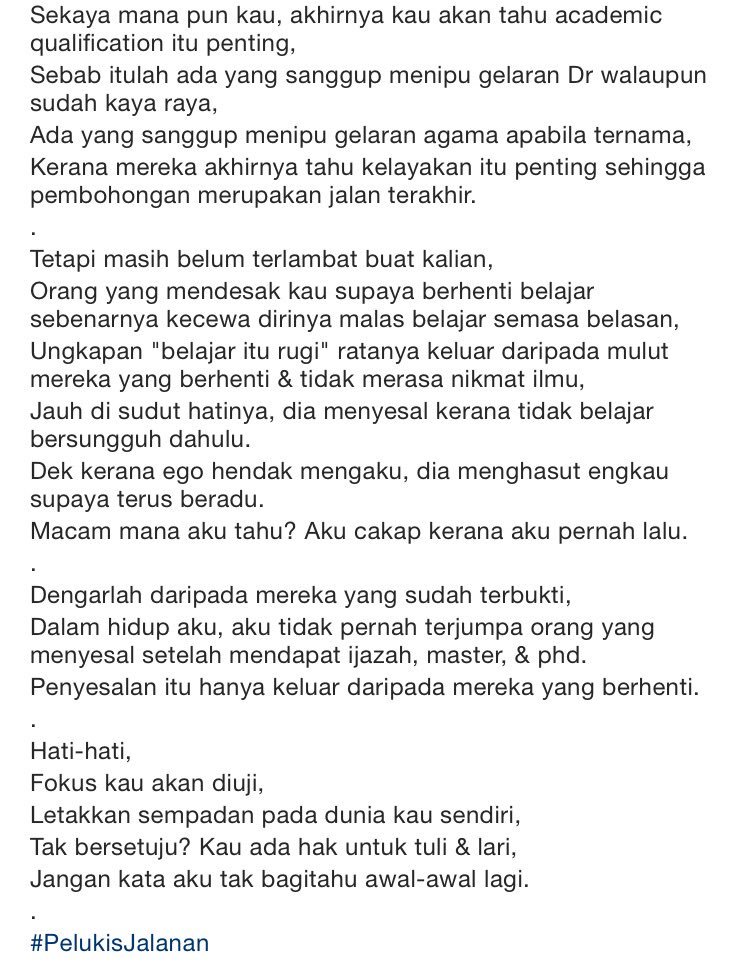 Teme Abdullah On Twitter Iqra Jgn Berhenti Menuntut Ilmu Dapatkan Academic Qualification Takpa Kalau Tak Setuju Nnti Jgn Kata Aku Tak Bgtahu Pelukisjalanan Https T Co Ydz6hwuq4t